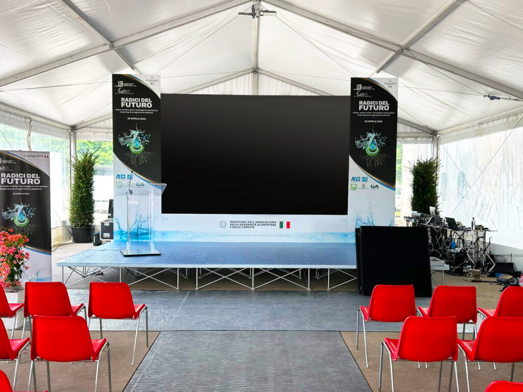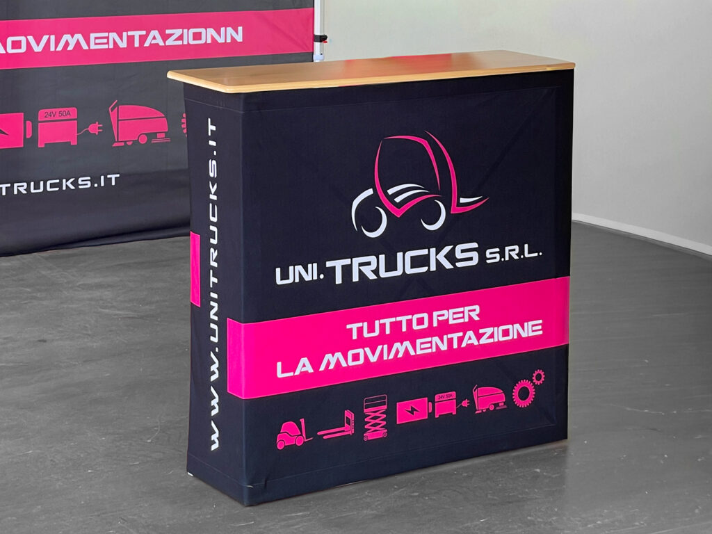 Soluzioni espositive riconfigurabili, con strutture modulari riutilizzabili: gazebi, desk promozionali, espositori personalizzati.